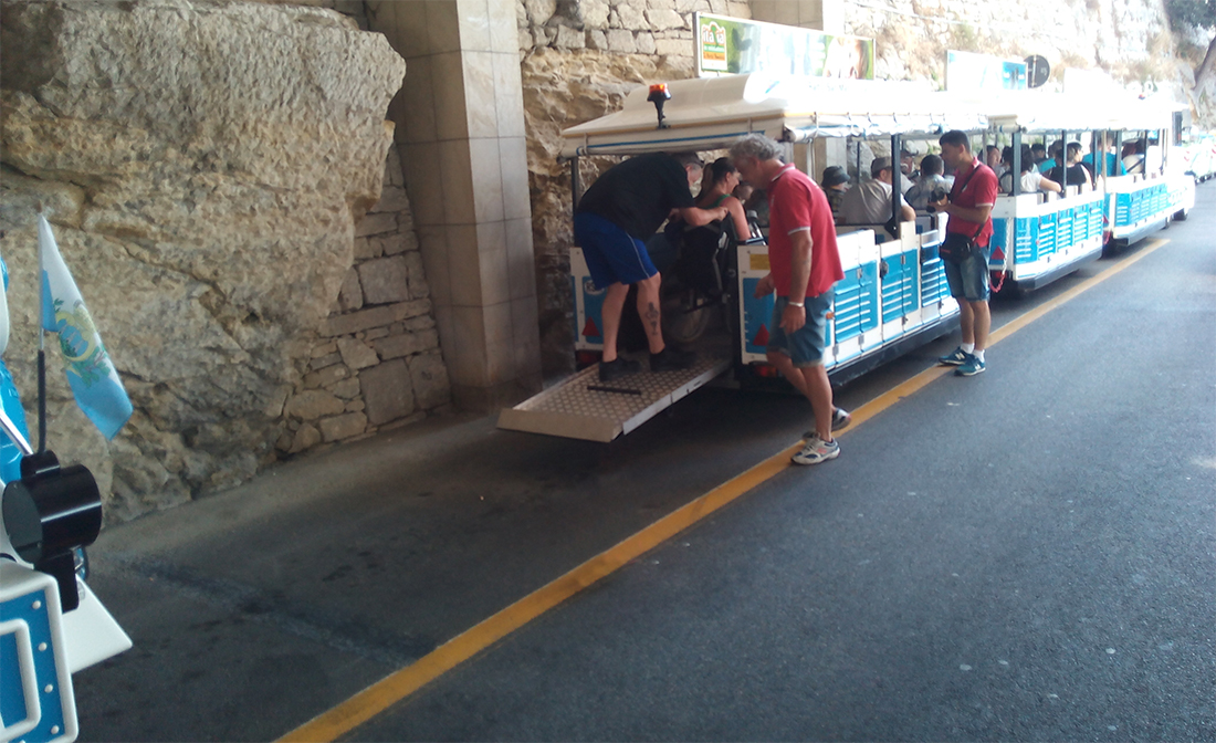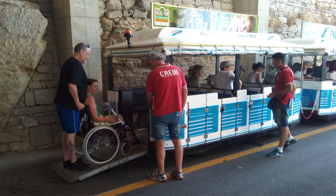 Il BY TRAIN SAN MARINO è dotato di pedana elettrica e di apposito spazio per ospitare a bordo passeggeri in carrozzella